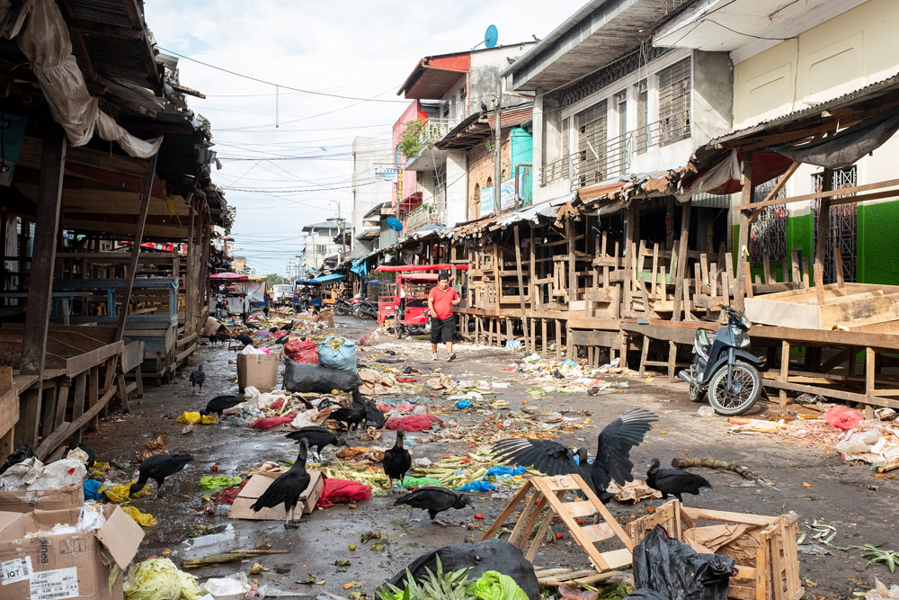 Iquitos ist erreicht und setzt gleich in vielerlei Hinsicht neue Maßstäbe in unserer Perureise. Es ist heiß und die Luftfeuchtigkeit dürfte kaum mehr gesteigert werden können. Auf jeden Einwohner kommen gefühlt 2 Motortaxis. Da Iquitos nur über Wasser oder per Flugzeug erreichbar ist, halten sich die Autos zwar in Grenzen, aber der andauernde Lärm und Gestank der Motortaxis gleicht dies mehr als aus. Der absolute Höhepunkt in negativer Hinsicht war für uns der Markt in Belen. Wir waren etwas spät dran und somit waren einige Bereiche schon leer. Der ganze Müll lagerte vor den Ständen und auf dem Müll saß Geier über Geier. Diesen Marktbesuch hatten wir dann auf das nötigste beschränkt.