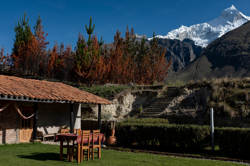 Mit dem Nachtbus kommen wir 8:30 Uhr in Yungay ab und werden gleich von Anton, dem Fahrer unserer Mountain Lodge, eingesammelt. Die 45 Minuten zur Lodge schlauchen fast mehr, als die 10 Stunden davor. Die „Straße“ und auch das Auto sind in so schlechtem Zustand, dass man bei jedem Schlagloch durch das Auto geschleudert wird. Die Lodge selber liegt dann auf 3300 Meter und ist von von mehreren Bergen über 6700 Meter eingerahmt. Auch der berühmte Paramount Picture Berg ist zu sehen. Der Anblick der schneebedeckten Bergspitzen ist spektakulär.