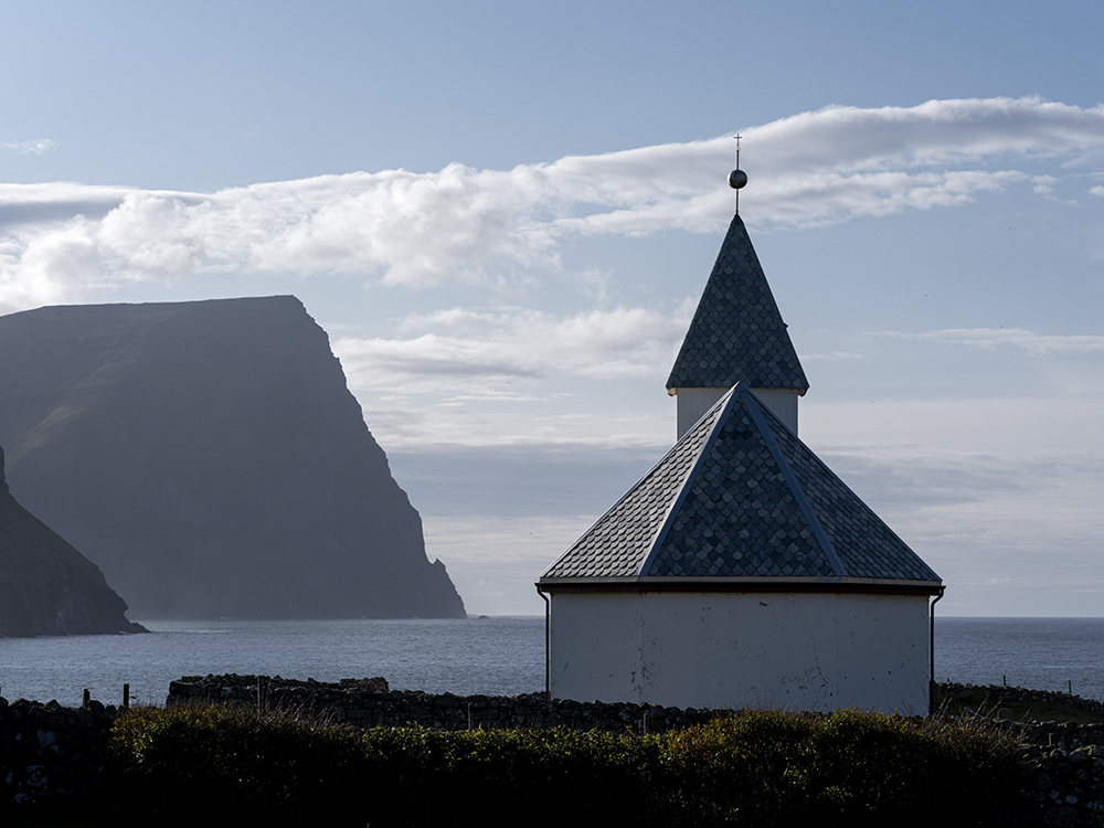 Wir genossen vor dem Abstieg noch die Aussicht und einen heiße Tasse Tee. Mit anhaltendem Rückweg kam die Sonne immer offensiver hinter den Wolken hervor. Als wir dann lecker Kaffee und Kuchen verzehrt hatten und wieder zum Auto gingen, war der Himmel blau. Wir entschieden uns noch ein paar abgelegenere Orte in unserer Umgebung abzufahren. Vidareidi war der letzte Ort auf der Insel Vidoy. Der Weg dahin führte direkt am Fjord lang. Der Ort hatte ein malerische Kirche, die direkt am Felsstrand lag und einen tollen Blick über das Meer und die angrenzende Insel darbot. Wir schnarchten im herrlichsten Sonnenschein am Meer entlang und genossen einfach die tolle Landschaft. Auf dem Rückweg fuhren wir die Straße durch den Tunnel zurück, um dann von Hvannasund noch einmal einen Abstecher auf der kleinen Stichstraße nach Muli zu machen. Hier gab es zwei herrliche Wasserfälle zu fotografieren und aufgrund der Einsamkeit war ein weiterer Drohneneinsatz möglich. Da die Seite des Fjordes schon im Schatten lag, wurde es dann aber ziemlich frisch. In der Hütte angekommen, waren wir dann gut durchgefroren. Eine ordentliche Portion Spaghetti half aber beim Energietanken.