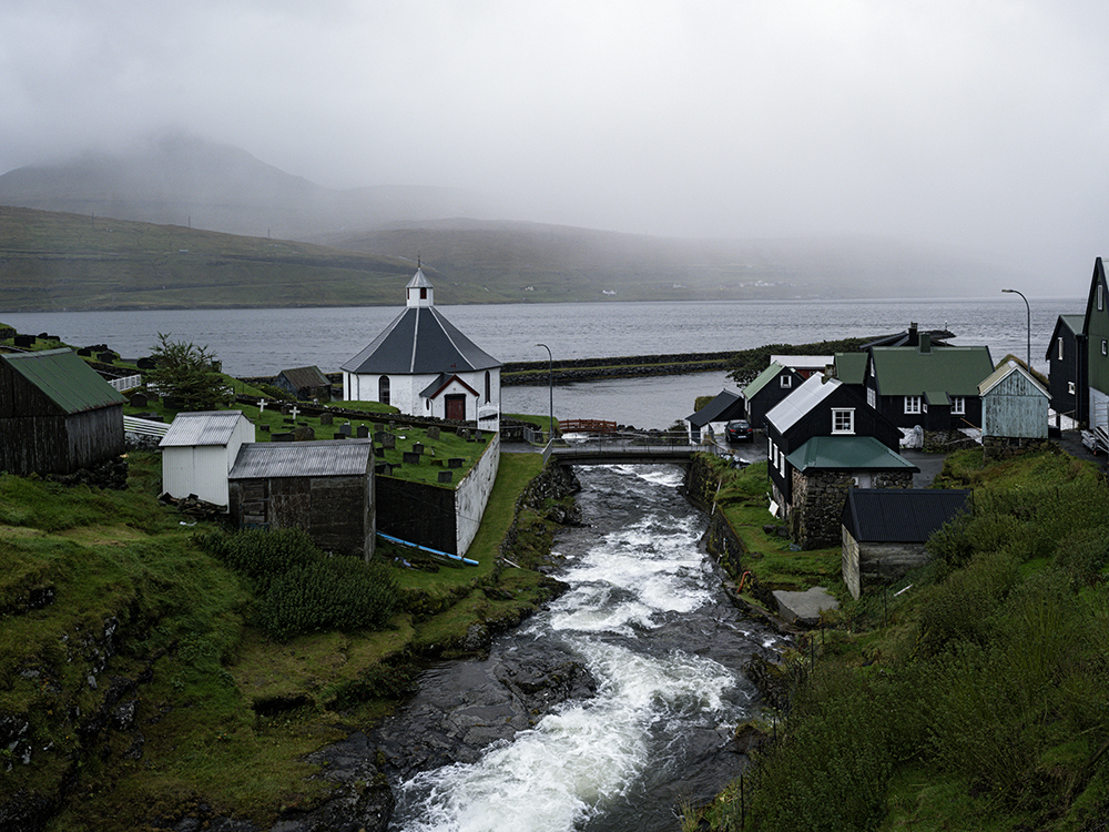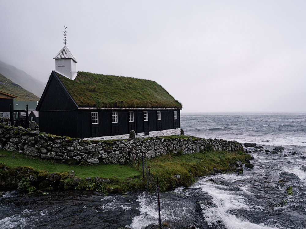 Nach dem wir uns dann wieder im Haus aufgewärmt hatten, fuhren wir noch die Gegend ab. Erster Stopp war ein kleine Bucht in der Nähe des Ortes. Die See tobte. Man hatte Mühe, von A nach B zu kommen. Diese Naturgewalten sind aber immer wieder faszinierend. Weiter ging es auf einer als besonders schön ausgezeichneten Straße ins Hochland. Wir besuchten den kleinen Fischerort Funningur. Er war noch recht ursprünglich, auch wenn diese Ursprünglichkeit durch neue Häuser immer mehr verloren geht. Wir verbrachten einige Zeit im Ort und genossen, dass außer uns keiner weiter unterwegs war. Einen weiteren Ort (Gjógv) streiften wir dann nur ganz kurz, weil es mir durch den vielen Regen und den Wind auch zu kalt wurde und der Körper diese Kälte schon in sich aufgenommen hatte.
