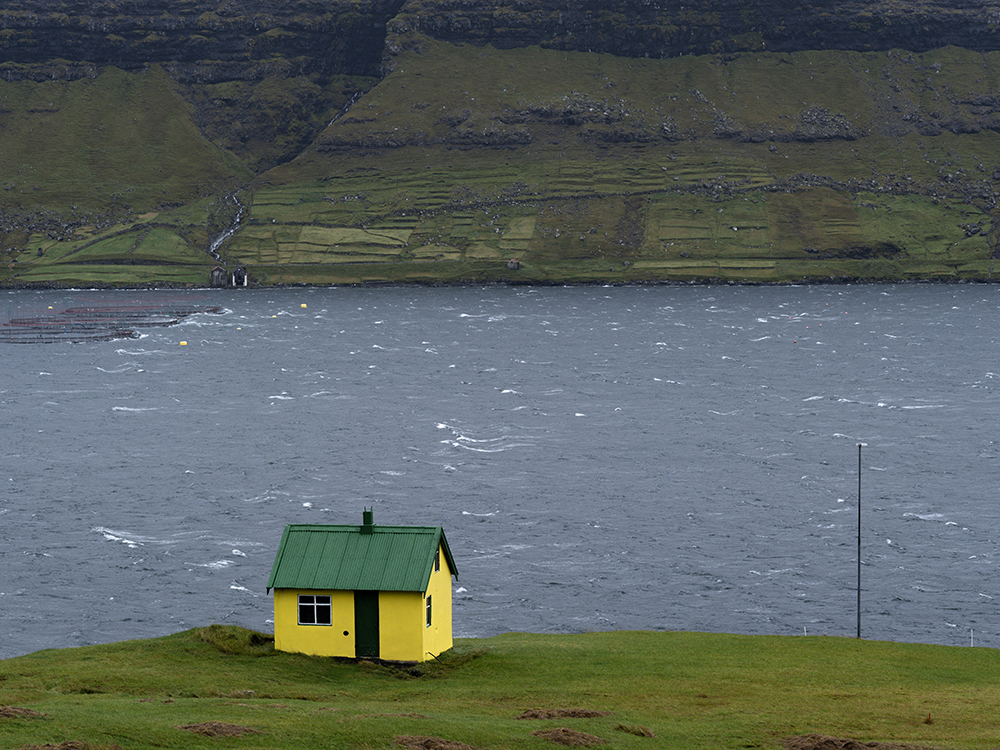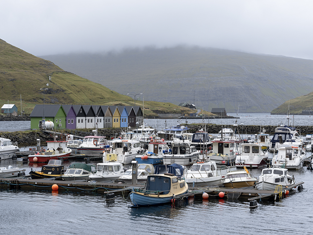 Das neue Haus ist sehr hell eingerichtet und hat eine große Fensterfront in Richtung des Fjordes. Wir können die Wetterwechsel live miterleben. Nach dem wir Kaffee getrunken hatten und der kräftigere Regen zu Ende schien, sind wir auch hier noch ein Weile durch den Ort und am Wasser langgelaufen. Vestmanna hat früheren Einfluss verloren, nachdem ein Tunnel zu der Nebeninsel gebaut wurde und somit die Autofähre nicht mehr benötigt wurde. Jetzt kann man hier noch Bootstouren zu den Vogelinseln buchen.