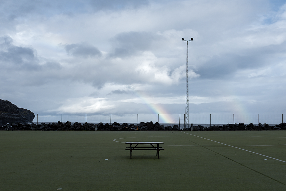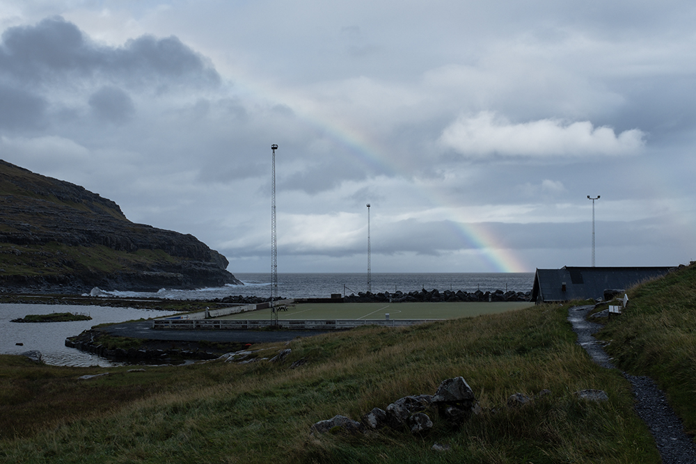 Die Tage in Eiði sind genauso gezählt, wie die Stunden, die wir tatsächlich die Sonne genießen durften. Zum Glück sind wir außerhalb der Saison und die Check-Out-Zeiten sind recht flexibel gestaltet. Also mussten wir nicht schon 10:00 Uhr raus und bis 15:00 die Zeit im Regen totschlagen. Wir sind, bevor wir uns zu unserer nächsten Unterkunft auf den Weg gemacht hatten, noch um einen kleinen See in der Nähe der Küste gelaufen. Obwohl man das bei dem schnellen Wechsel von Sonne und Regen öfter erwarten würde, bekamen wir unseren ersten Regenbogen zu sehen. Es war auch nur ein halber mit gedämpfter Leuchtkraft. Wo keine richtige Sonne…