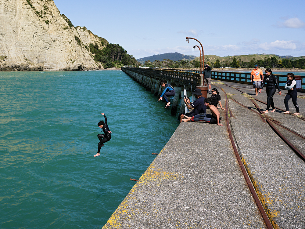 An der wohl längsten Betonbrücke der südlichen Hemisphäre am Tolaga Bay Wharf konnten wir eine Gruppe Kinder mit ihrem Ausbilder beobachten. Dabei werden den Kindern die Gefahren des Meeres nähergebracht und wie sie lernen, in dem nassen Element ruhig zu bleiben. Der Höhepunkt war, dass einige von ihnen von der hohen Brücke ins Meer gesprungen waren. Ich würde tippen, dass die Brücke ca. 5-7 Meter hoch war. Jedenfalls waren die meisten echt furchtlos.