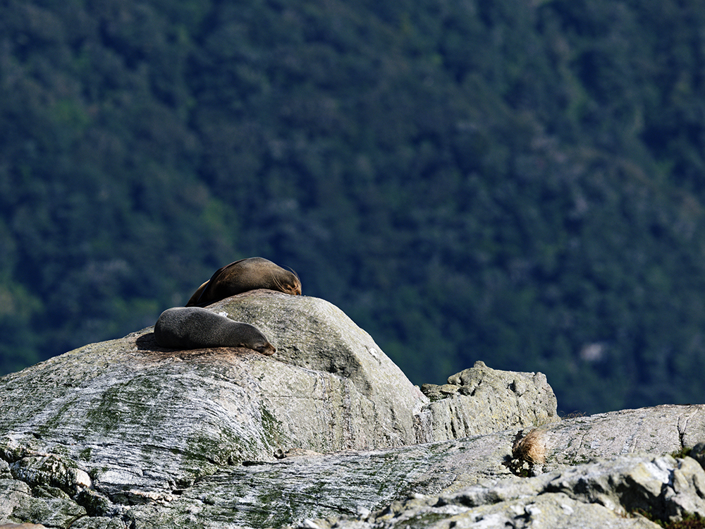 Das hieß also, 20 km mit dem Auto zum Lake Manapouri, dann 1 Stunde mit dem Boot und 140 Personen über den Lake zum Wasserkraftwerk, mit 3 Bussen die 20 km zum Doubtful, dann endlich 3 Stunden durch den Fjord und alles wieder zurück. Die Fahrt durch den Fjord hat sich gelohnt. Wir hatten super Wetter und der Regen von den Vortagen bescherte uns noch einige Wasserfälle. Bis auf einen kurzen Ausflug aufs offene Meer zu den Robben war es eine sehr gemütliche Bootsfahrt. Auf dem Meer wurde es etwas achterbahnmmäßiger. Aber alles im Rahmen.