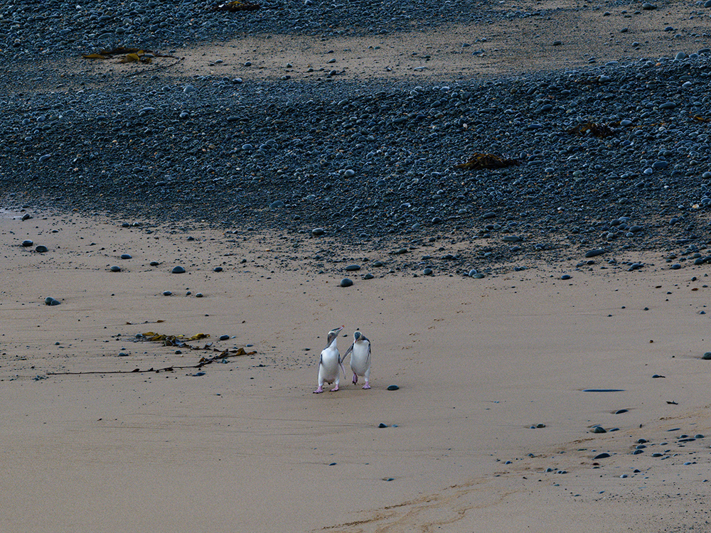 Vorher fuhren wir aber noch einmal Richtung Oamaru. Es gibt einen Strand, an dem sich vor dem Sonnenuntergang Gelbaugenpinguine sehen lassen könnten. Wir hatten dann auch das große Glück, welche aus der Ferne zu sehen. Ein Mann, der die Pinguine zählte, meinte es wären derzeit 6 Stück in dem Gebiet. Wir hatten 3 gesehen. Was will man mehr.