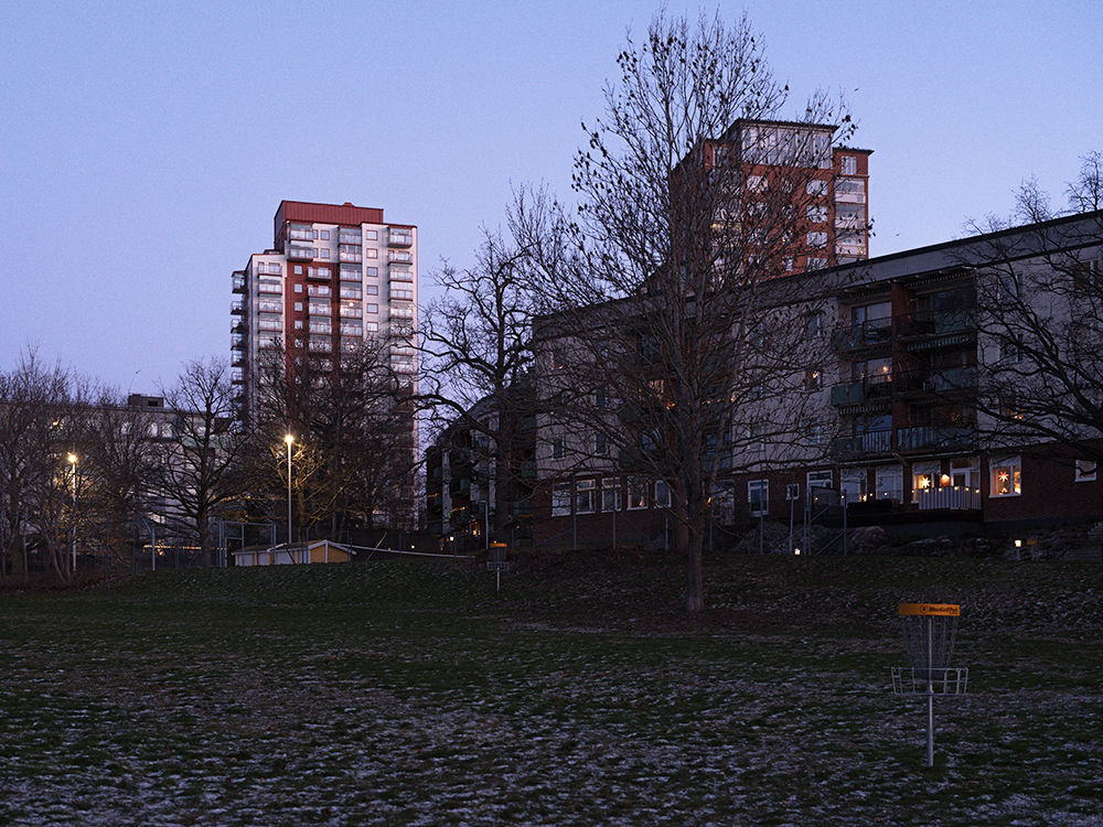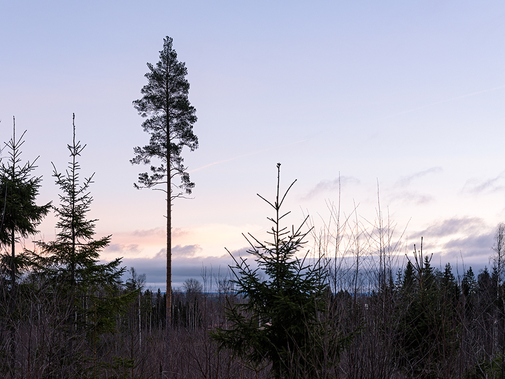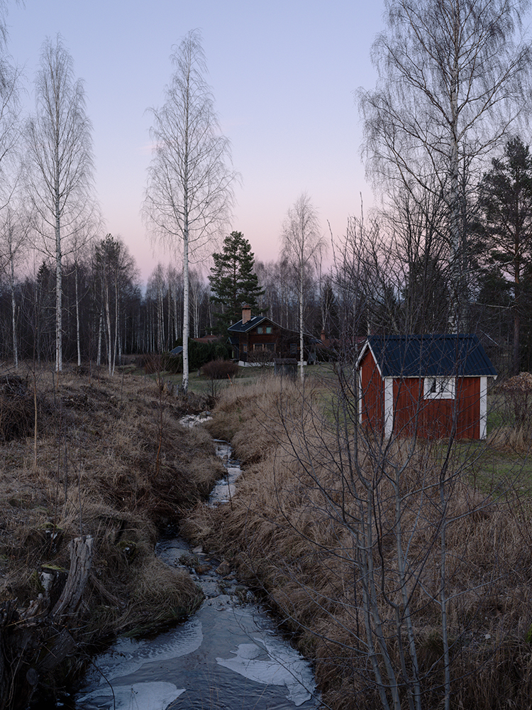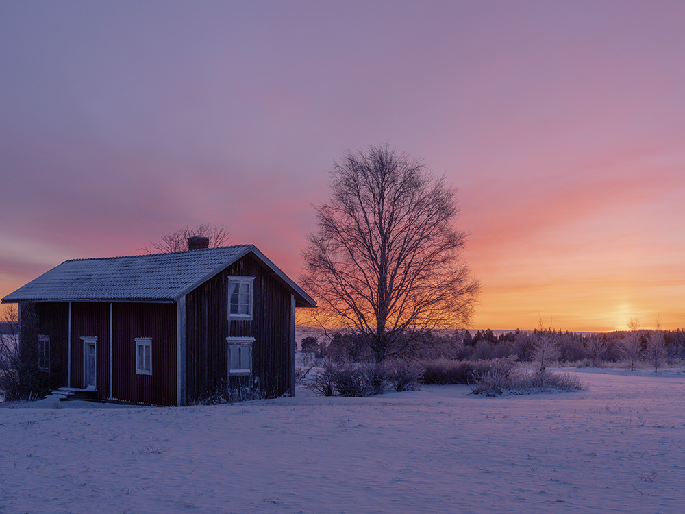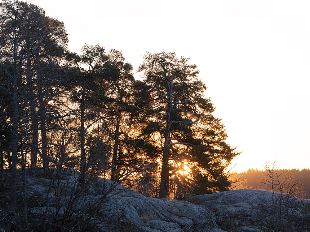 Die Wanderung ging an ein paar typisch schwedischen Häusern vorbei in den Wald mit Blick auf die Berge in Richtung Norwegen und wieder zurück. Die ganze Zeit hat sich die Sonne hinter Schleierwolken versteckt, so dass sie zu sehen war, aber ein ganz diffuses Licht hervorbrachte. Mit dem Sonnenuntergang kamen dann wieder pastellische Farbtöne mit ins Spiel.