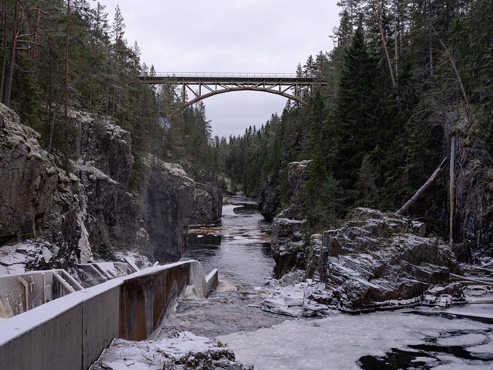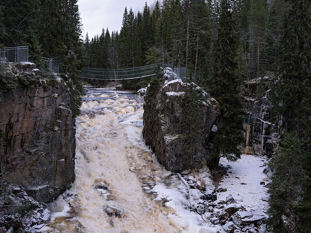 Neben den Frankfurter Deutschen trafen wir auch noch welche aus Südhessen. Die gaben uns für den nächsten Aussichtspunkt noch einige Tipps. Dieser Halt war dann am Storstupet. Der Canyon war noch der selbe von weiter oben. Das Wasser wurde hier noch durch Betonabschnitte künstlich eingeengt und beschleunigt. Das Highlight war die Eisenbahnbrücke, die über den Canyon führte. Durch die Hinweise unserer Südhessischen Kurzbekanntschaft kamen wir hoch zur Brücke und überquerten diese dann auch. Die Beschaffenheit der dünn anmutenden Bretter und die sehr offen gestalteten Geländer am Rand ließen in uns ein flaues Gefühl beim Überqueren aufkommen. Das Knarren der gefrorenen Bretter beim Betreten untermauerte dieses Gefühl stärker als gewünscht. Jedenfalls hatte sich die einstündige Anreise an den Canyon gelohnt.