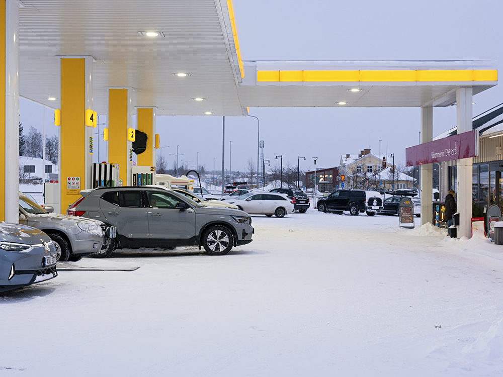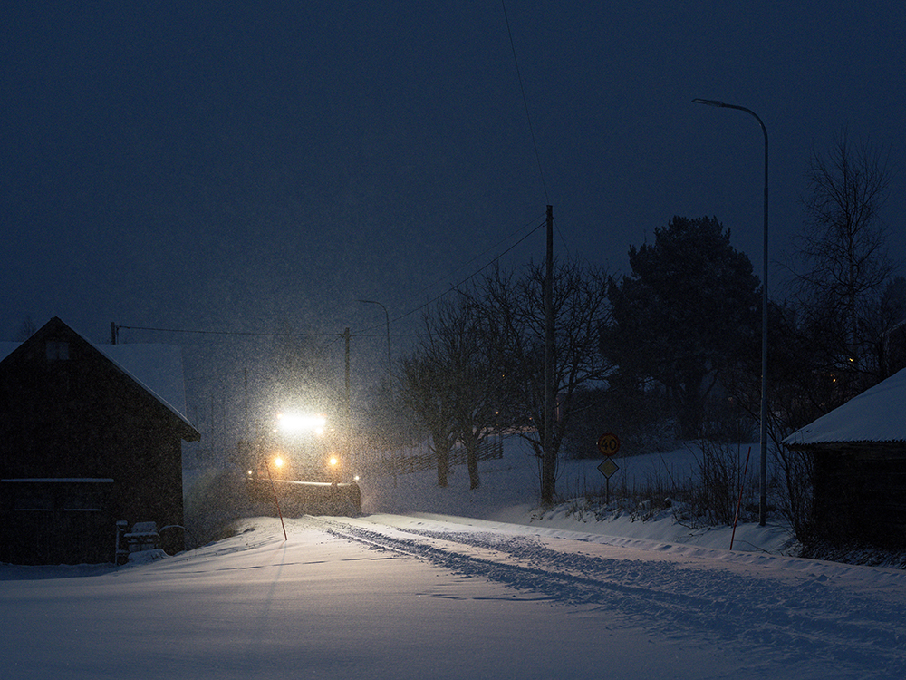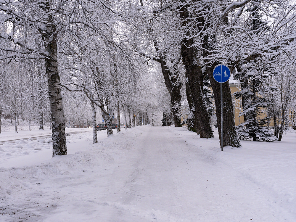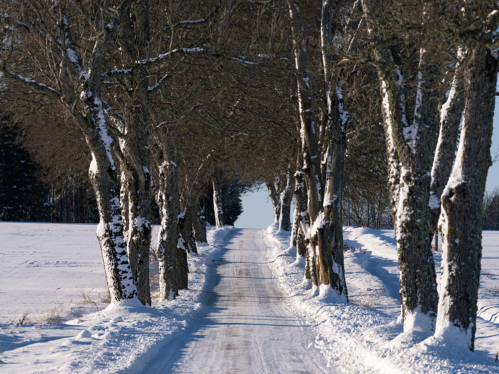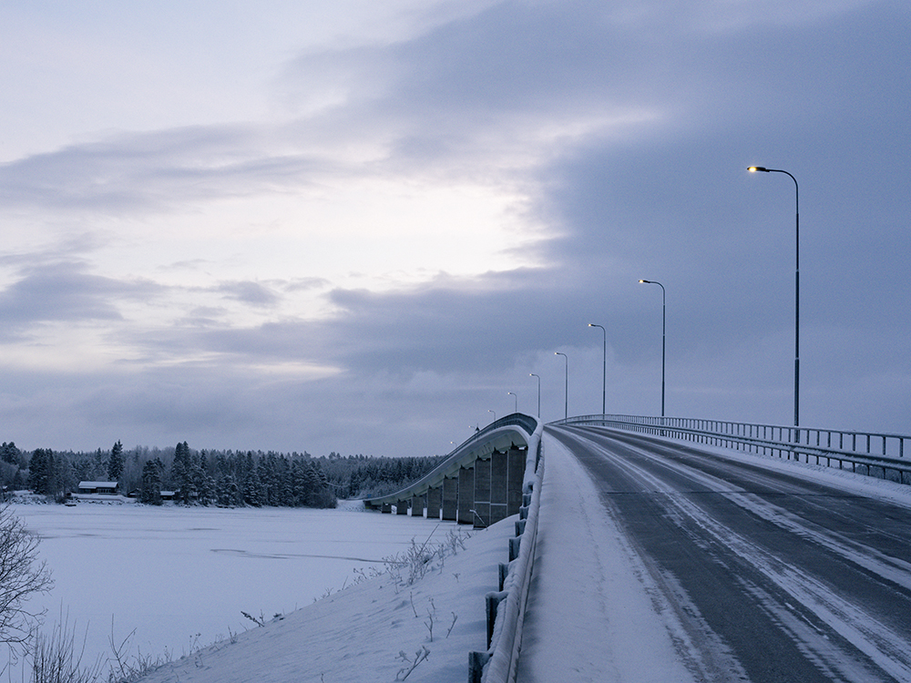 Es ging 4,5 Stunden geradeaus. Die Straßen waren in gutem Zustand. Das war nach dem Schneefall der letzten Tage nicht zu erwarten. Meine Befürchtung war, dass sich gleich auf den ersten Kilometern ein Schleicher vor uns setzt, der permanent 10 Km/h langsamer fährt, als es erlaubt ist. Glücklicherweise hatten wir das nur sehr selten und noch mehr Glück hatten wir, dass der Urlaubsendverkehr nicht in unsere Richtung fuhr. Somit waren wir die meiste Zeit tatsächlich allein auf der Straße. Da man nicht immer erkennen konnte, ob es glatt ist oder nicht, gab es regelmäßige Bremsversuche. Die Winterreifen in Verbindung mit den Spikes (die bei uns nicht erlaubt sind) leisten hier ganze Arbeit. Bei all unseren Winterurlauben in den Norden lege ich großen wert darauf.