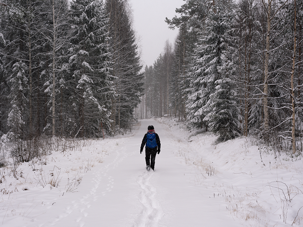 Wir wanderten nach der morgendlichen Stärkung 2 Stunden durch den Winterwald. Direkt hinter unserem Haus fängt ein breiterer Forstweg an. Wir waren jedenfalls die ersten Spuren im Neujahrsschnee und es schneite immer weiter.