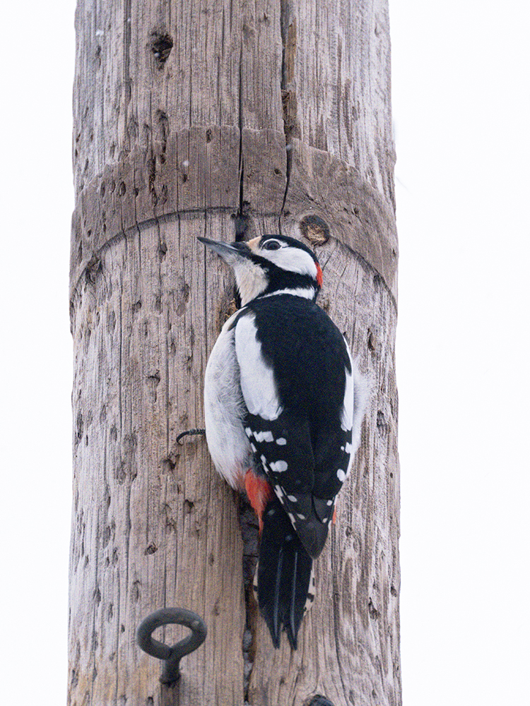 Bevor wir uns auf den Weg machten, durfte ich noch schön das Auto freischaufeln. Zum Glück hatte ich es nicht in der Senke im Garten geparkt. Dann beobachteten wir noch einen Specht, der den Elektromast anspechtete. Man sagt ja immer, Spechte hacken in Totholz. Aber ob er sich da nicht vertan hat der Gute?