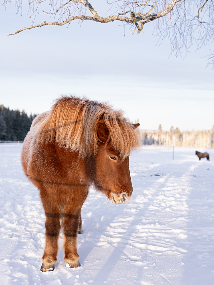 Damit war der Ausflug hinfällig. Da wir schon angezogen waren, gingen wir halt zu Fuß. Diesmal trafen wir einen weitläufig direkten Nachbarn mit seinen Pferdchen, zwei davon waren Island Pferde und eins ein Shetland. Sie waren alle zum Glück gut bepelzt und trotzten somit der Kälte.